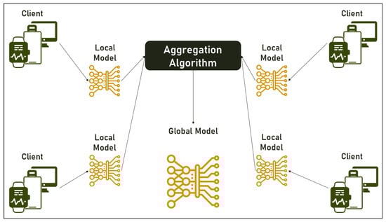 After that, in the federated learning domain, an aggregation algorithm is defined as the technique that aggregates the result of training multiple smart models on the clients’ side using their local data. This algorithm is the part that handles the fusion of the results obtained from the local clients training, and updating the global model. The aggregation algorithms in federated learning are discussed and reviewed in detail in this paper. In addition, Figure 2 illustrates the aggregation algorithm in the federated learning domain.