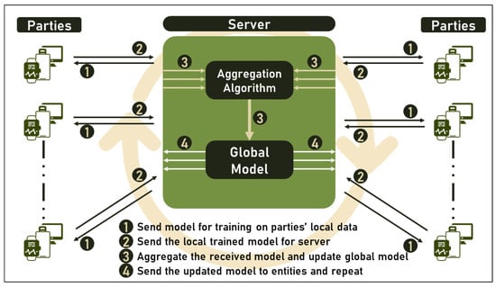 Typically, a federated machine learning environment consists mainly of a set of four groups of entities, namely, the main server, the parties, the communication framework, and the aggregation algorithm [,,]. Each of these entities assumes a specific role in the federated learning process. These entities can be defined as follows: