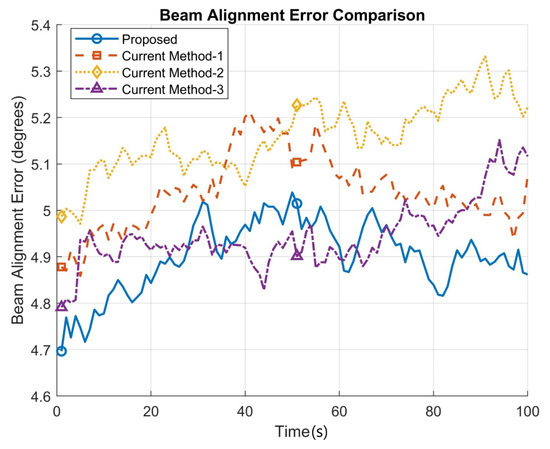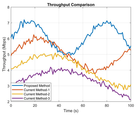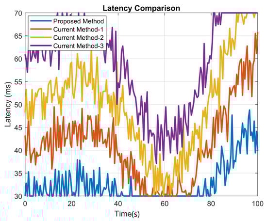 By optimizing beam-switching decisions, the system can adapt to rapid changes in channel conditions and interference, minimizing delays in data transmission and reducing overall latency. The proposed 6G system exhibits lower latency than the other methods due to the DRL agent’s real-time decision-making capabilities and the inherent low latency of 6G technologies. The combination of these factors allows for the rapid adaptation of beam-switching decisions in highly dynamic V2V environments. As a result, the system can maintain strong communication links and minimize delays in data transmission, even in the presence of rapid channel variations and interference. As shown in Figure 5, we can observe that the latency of the proposed method is marked as the lowest at the 58th second, which is 10.2 ms.