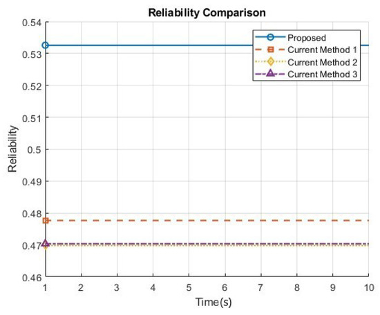 The reliability of the proposed 6G system is significantly higher than the other methods, as the switched beam antenna and the DRL agent work together to maintain robust communication links. The integration of 6G technologies, such as advanced error correction codes and massive MIMO, enhances the resilience of the system to packet loss and link failures. Consequently, the proposed system offers improved reliability in the challenging communication scenarios typical of 6G V2V networks. Results are illustrated in Figure 6.