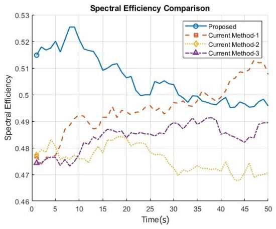 The proposed system outperforms the other methods in terms of spectral efficiency, as the intelligent beam-switching and adaptive antenna configurations enabled by the DRL agent allow for more efficient use of the 6G frequency spectrum. The system can maximize data transmission rates within the limited spectrum, providing superior spectral efficiency compared to the other methods as shown in Figure 7.