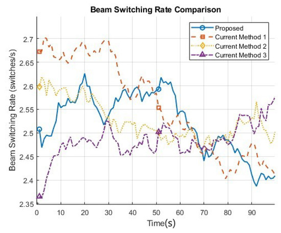 Beam-switching rate is a measure of the speed at which a switched beam antenna can change its beam direction. In switched beam antennas, the beam direction can be changed electronically, allowing the antenna to steer its beam in a specific direction to provide directional transmission and reception of signals. The beam-switching rate is an important factor in switched beam antennas because it determines the speed at which the antenna can respond to changes in the location of the device it is communicating with. In high-speed mobile networks, for example, a fast beam-switching rate is necessary to maintain communication with a moving device and ensure that the signal remains strong and reliable. A high beam-switching rate also allows the antenna to support multiple users by quickly switching between beams to provide directional transmission and reception to each user. This can be particularly important in dense urban environments, where multiple users may be present in a small area, and in satellite communications, where multiple beams may be required to cover a large geographic area. To achieve a fast beam-switching rate, we incorporated the system model with advance reinforcement leanings, and the switching rate, on average, of the proposed method tended to be at the lower end, which shows the robustness of the model. Results are illustrated in Figure 9. The proposed method approaches switching rates as low as 2.4 switches/seconds, which is reliable for high-speed V2V communication. Frequent beam switching, however, affects the system throughput. Every time a beam switch occurs, there is a period during which the system has to adjust to the new beam configuration, potentially leading to a temporary reduction in throughput as the system may not operate at its full capacity during the adaptation process.