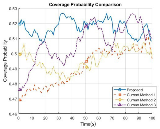 The coverage probability results for the proposed system model, which integrates a switched beam antenna with a 6G V2V communication system and leverages deep reinforcement learning (DRL) for real-time adaptation, provide valuable insights into the system’s performance. In the simulation, we assessed the coverage probability under various scenarios, considering dynamic vehicular environments, diverse channel conditions, and different network loads. The coverage probability is calculated as the ratio of the number of successful communication links (i.e., links with a signal-to-interference-plus-noise ratio (SINR) above a predefined threshold) to the total number of communication links in the network. The results indicate that the proposed system consistently achieves higher coverage probability values compared to the existing state-of-the-art methods. This improvement is primarily due to the DRL-based adaptive beamforming, which allows the system to intelligently select the optimal beam direction and adapt to changing channel conditions. The switched beam antenna’s capability to steer the radiation pattern towards the intended receiver, while mitigating interference from other sources, further enhances the coverage probability. A detailed analysis of the results demonstrates that the proposed system model is more resilient to the challenges posed by dynamic vehicular environments, such as user mobility, shadowing, and multipath fading. The increased coverage probability achieved by the integrated system model implies that users in the 6G V2V communication network are more likely to maintain a high-quality communication link, leading to improved network performance, reliability, and user satisfaction, as shown in Figure 10.