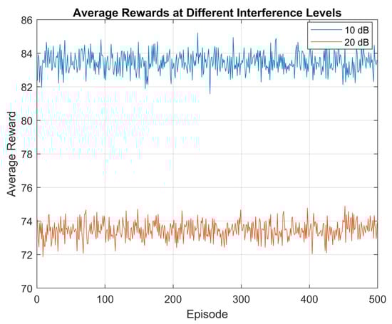 According to Figure 13, at an interference level of 20 dB, the average reward over 5000 episodes was 20. This shows that the agent was able to perform well in the environment and receive a high level of rewards. The high average reward indicates that the agent is able to effectively navigate the environment and achieve its goals despite the presence of interference. Overall, these results suggest that the level of interference has a significant impact on the agent’s performance and the rewards it receives. The results also highlight the importance of considering the impact of interference when designing and evaluating reinforcement learning systems in V2V environments.
