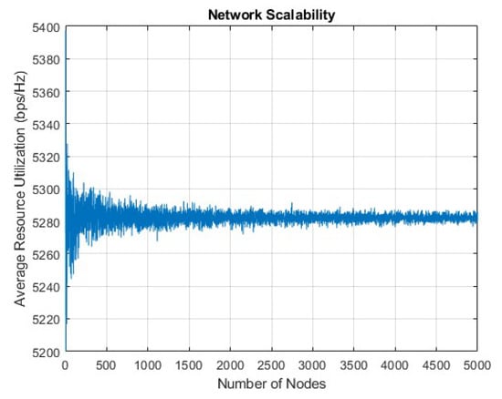 The proposed 6G system exhibits better network scalability as the number of nodes in the V2V communication environment increases. The DRL model’s continuous learning and adaptation capabilities, combined with 6G technologies such as network slicing and edge computing, ensure that the system can handle more complex scenarios without a significant loss in performance. This feature is essential for supporting the increased density of connected vehicles and devices expected in future 6G V2V networks. Scalability is tested on 5000 vehicular nodes to check the robustness of the system in highly dense environments. Scalability contains average resource utilization in bits per second per Hertz (bps/Hz); it is a measure of the efficiency of a communication system in terms of the amount of data that can be transmitted per unit of bandwidth. In general, higher average resource utilization indicates that the communication system is more efficient in terms of the amount of data that can be transmitted per unit of bandwidth, and can result in improved performance and higher data rates. This is especially important in modern wireless communication systems, where bandwidth is a scarce and valuable resource, and the demand for high-speed data transmission continues to grow. As can be seen in Figure 16, average resource utilization in bps/Hz is very stabilized between 5300 and 5260, which is considered stable in modern communication depending on use case.