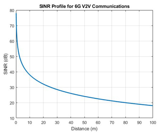 The graph illustrated in Figure 17 demonstrates a gradual decrease in SINR from approximately 80 dB to 19 dB as the distance between the transmitter and the receiver increases from 0 to 100 m. As the distance between the transmitter and the receiver increases, the path loss also increases, leading to a weaker received signal strength at the receiver. Consequently, the SINR decreases as the distance increases. Furthermore, at shorter distances (closer to the transmitter), the SINR is relatively high (around 140 dB), indicating that the signal strength is much stronger than the noise level. In this region, the communication link quality is expected to be excellent, enabling high data rates and reliable communication. As the distance increases, the SINR gradually decreases, reaching approximately 19 dB at 100 m. Even at this distance, the SINR is still relatively high compared to typical wireless communication systems, suggesting that the communication V2V link quality is still good.