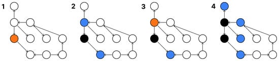Example of the procedure chosen in the creation of a subset. The orange node represents the start node added to the subset. In the first step, this node was randomly sampled from the dataset. In later iterations, sampling was based on distance to the first node. The blue nodes represent edge nodes (of the subgraph), and the black nodes represent nodes that have already been processed.