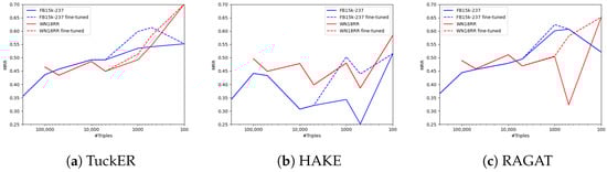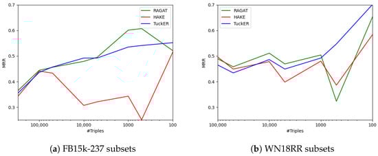The performance of TuckER as well as RAGAT increased on the FB15k-237 subsets as the dataset size decreased. On the one hand, this was a positive trend. On the other hand, some improvement in the metrics was due to the design of the scenario. Once the number of entities decreased and, thus, there were fewer triples, an overall improvement in performance could be expected due to the reduction in the size of the search space. Hence, the scores obtained on these reduced datasets should not be compared to the scores obtained from the literature. A Hits@10 score of 0.5 was not as meaningful as on the original datasets. To illustrate this fact, consider the maximum possible triples against which a true triple from the test set is evaluated, comparing FB15k-237 and FB100: In FB15k-237, there are a total of 14,541 entities. For a triple , the head entity is replaced by each possible other entity in the evaluation, and the same is carried out for the tail entity to generate a set of triples against which the true triple is ranked. On FB15k-237, the maximum number of candidate triples is for each of the sets. Compared to this, the maximum number of candidate triples on FB100 is . In this case, due to the filtered settings, whereby all known true triples are also removed from the candidate set, there are in general fewer triples in both sets. Subsequently, it becomes statistically easier to rank true triples higher, as the number of possible entities decreases. Therefore, the models did not necessarily capture the information in the smaller subsets better than before, but it was easier to achieve better performance in terms of the metrics. However, the results still showed that the tested models were able to adapt to few-shot learning, thus achieving the evaluation goals.
