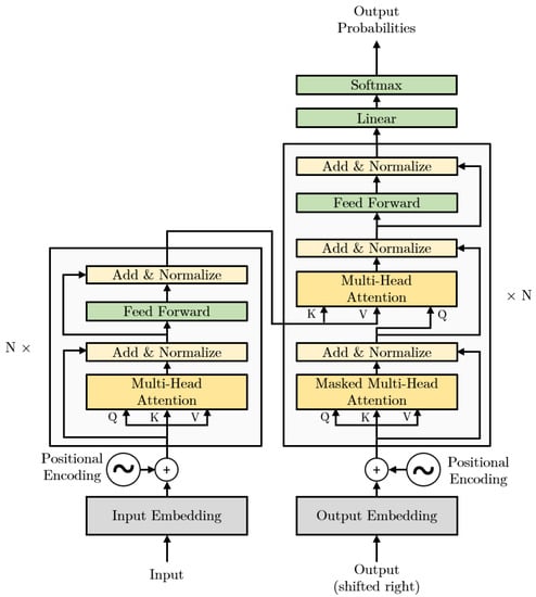 - Vaswani, A.; Shazeer, N.; Parmar, N.; Uszkoreit, J.; Jones, L.; Gomez, A.N.; Kaiser, Ł.; Polosukhin, I. Attention is all you need. In Proceedings of the Advances in Neural Information Processing Systems: Annual Conference on Neural Information Processing Systems 2017, Long Beach, CA, USA, 4–9 December 2017; Volume 30. [Google Scholar]