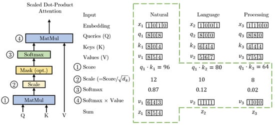 The main computational focus in the transformer is the attention function that maps a query and a set of key–value pairs to an output. The model uses multi-head attention where each head is a single attention block, referred to as the scaled dot-product attention. This mechanism searches over the input sequence and calculates the relevance of the input and determines where to attend [,].