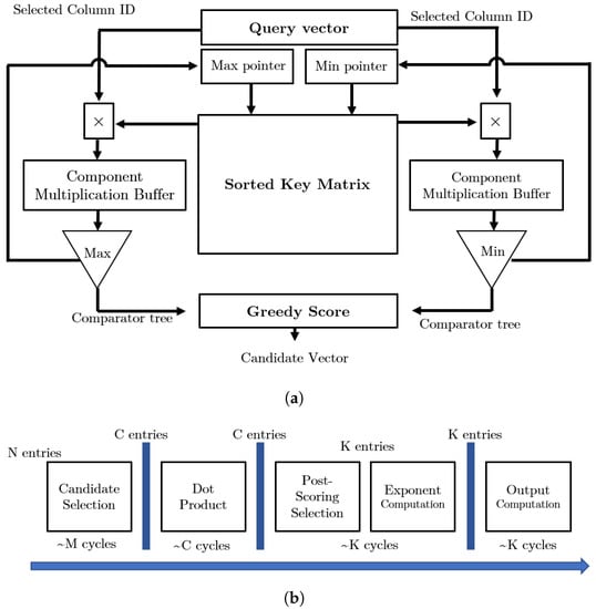 Overview of the accelerator []. utilizes a greedy algorithm to choose candidates by first finding the maximum and minimum values of query and key products. The candidate selection module takes around M cycles to identify C candidates. The approximated attention computation for the chosen candidates takes a total of cycles, where is a constant and K represents the top entries chosen by the post-scoring selection module. (a) candidate selection module []. (b) High level implementation steps of accelerator [].