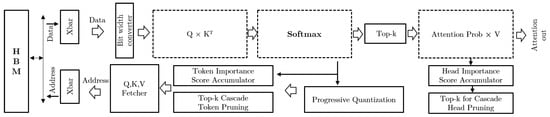 To dynamically process each input for efficient hardware execution, a specialized high parallelism top-k engine is designed for SpAtten to rank token and head importance scores for pruning. By utilizing a quick-select module that selects the kth largest element as a threshold to filter the input, this top-k engine achieves linear time complexity , i.e., the runtime scales linearly with the size of the input. The top-k engine retrieves the k most relevant keys (K) for a given query (Q) by evaluating the importance score of each token and ranking them accordingly. After identifying the relevant query–key pairs, a matrix–vector module is used to compute their corresponding attention scores. These scores are then passed through a softmax unit to calculate the attention probabilities. The resulting probabilities are subsequently sent to an on-chip bit-width converter, which performs progressive quantization. Following that, based on the top-k selected k-most important values, the final attention output is computed. Once all the necessary computations are completed within a single head, the head’s importance score is calculated. After computing all the heads in a layer, the top-k engine prunes the ones that are deemed unimportant. This cascade pruning technique ensures that the pruned heads are not computed in the subsequent layers. This helps to reduce DRAM access, thereby improving the overall efficiency of the system.