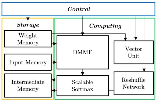 The three primary components of the STA architecture are the storage block, the computing block, and the control block. Within the computing blocks, there are several elements including a Diverse MatMul computing engine called DMME, a scalable softmax module, a vector unit, and a data reshuffle network. DMME performs N:M sparse operations: sparse–dense and dense–dense matrix multiplication during run time with dynamic configuration while maintaining high efficiency. The computational efficiency of sparse–dense matrix multiplications is significantly improved by selecting only the non-zero weight parameters and their corresponding activation values for computation, thereby reducing the number of unnecessary computations. Meanwhile, multi-headed attention residual computations can be executed without off-chip memory transfer in the scalable softmax, thus eliminating off-chip memory access. Intermediate memory block stores all the intermediate results to reduce additional communication to off-chip memory.