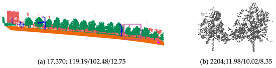 The second set of experimental data was street trees extracted from the Oakland point cloud data (Figure 3a). The Oakland point cloud data were collected around the Carnegie Mellon University (CMU) campus in Oakland, using Navlab11 equipped with side looking SICK LMS laser scanners, and were opened by D. Munoz et al. [37]. The distance between two adjacent trees on the roadside was manually planned, and the distance between them was relatively large. Most of the adjacent trees had no intersecting areas between their crowns, resulting in accurate individual trees isolated using most of the existing methods, such as region growth or clustering. Therefore, we only chose two trees with overlapping crowns, as shown in Figure 3b, and named OaklandTrees to test our proposed soft segmentation algorithm.