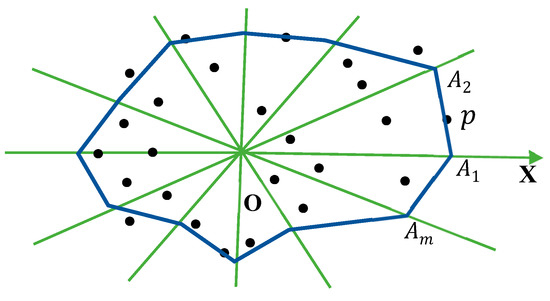 For each layer bin, the boundary points were detected based on a 2D α-shape. The classical α-shape method was introduced by H. Edelsbrunner in 1983 [40], and Bernardini et al. [41] improved it to probe the boundary of a point set by setting , in which r is the radius of a disc in a 2D plane or a ball in 3D space. In our case, we projected all the points of a bin onto a horizontal plane xOy, as shown in Figure 10, and obtained the boundary points of each original bin based on Bernardini’s method [41].