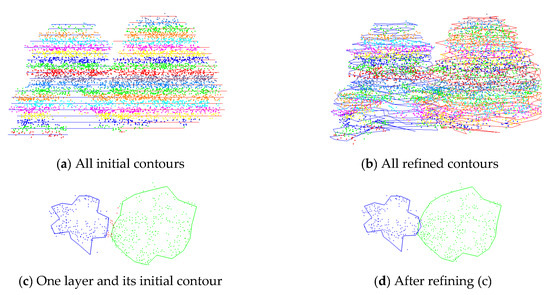 Using the 2D contour extraction approach, we obtained the contour of each layer tree by tree, or 2, as shown in Figure 11a. Figure 11c provides an example of a layer where the contours of the two trees did not overlap, and the unlabeled (red) points were not determined as to which tree they belonged to.