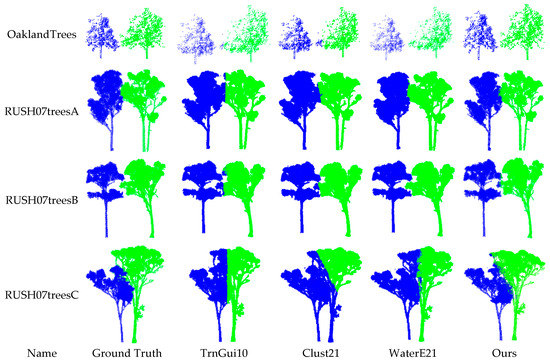 Another set of experimental data was three pair of trees, which were extracted from RUSH07, as shown in Figure 4a. The point cloud data were acquired in the native Eucalypt open forest (dry sclerophyll box-ironbark forest) [38] in Victoria, Australia. Please refer to the introduction of this database for the geographic information and the data composition of the scanned plot.