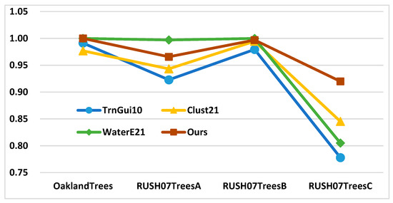 According to the confusion matrixes and Formula (11), the accuracy (Ac) of the segmentation results could be calculated. The values of the segmentation accuracy of the four pair point clouds segmented using the four methods are displayed as line chart in Figure 15. From the perspective of the segmentation accuracy, these four segmentation methods accurately segmented the three point cloud data, OaklandTrees, RUSH07treesA, and RUSH07treesB, and the segmentation accuracies were all greater than 90%. However, for the segmentation of RUSH07treesC, only our method had a segmentation accuracy exceeding 90%, showing an optimal robustness.
