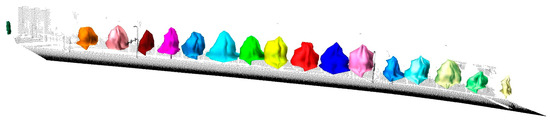 For the point cloud, Oaklandtrees (Figure 3), after the segmentation with our SoftSeg method, all the tree shape silhouette meshes were reconstructed, as illustrated in Figure 17. The attributes of all the trees are listed in Table 4. In this table, the volume was calculated using Formula (11), and its unit was m3. As shown in Table 4, the point cloud of each segmented tree was very sparse, and the accuracy of the calculated attribute values needs further verification in future research.