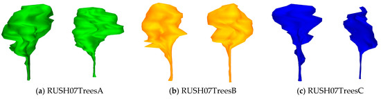 For the three point clouds of the three pair of trees, as shown in Figure 4, after the segmentation using the SoftSeg method, the reconstructed mesh models of the individual trees are displayed in Figure 18. To enhance the visual differentiation, the different pair trees models used different colors. Visually, these silhouette mesh models have a more natural appearance.