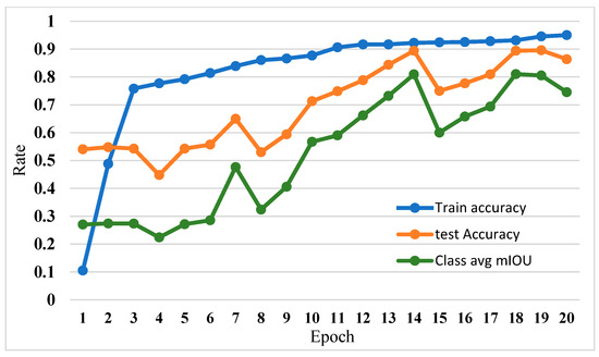 The training accuracy, the test accuracy, and the class average mIOU varied in the training and testing process.