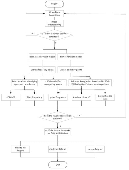 The algorithm flow is as follows: First, real-time video images of the dispatcher are obtained using a video acquisition device. The key points of the eyes and mouth are extracted using the RetinaFace model, while the key points of the body posture are detected using the high-resolution network (HRNet). After the point detection model [28] has extracted these key points, it inputs them into the SVM and the Bi-LSTM-SVM adaptive enhancement algorithm model to obtain the eigenvalues of the fatigued state, which are then used as the input of the artificial neural network to calculate the fatigue state using multi-feature fusion.