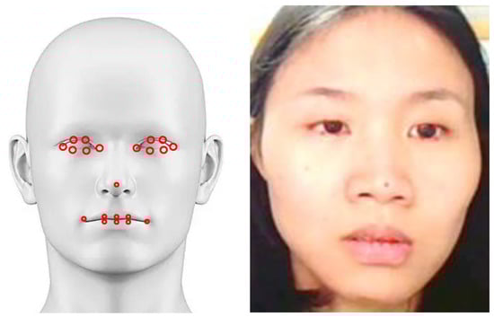 In this paper, the commonly used public dataset 300 W was used for the quality assessment of facial key point detection. The environment for this experiment used a camera (1280 × 720), a GPU NVIDIA Geforce GTX 1080Ti, and a graphics memory of 11 GB. The training set of this dataset had a total of 3148 images, and the testing set contained 689 images. In this paper, 12 key points of the eyes, 1 key point of the tip of the nose, and 8 key points of the mouth were used.