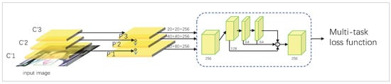 The pyramid structure of the FPN feature map was employed to enhance the detection of small-sized faces. In the fatigue detection scene of the dispatcher, the face area in the collected image accounts for a moderate proportion of the original image. Therefore, in RetinaFace, the P2 and P6 layer structures of the original feature pyramid network of the model can be removed, which greatly improves the reasoning speed and accuracy of the model. The feature pyramid network designed in this paper is shown in Figure 4.