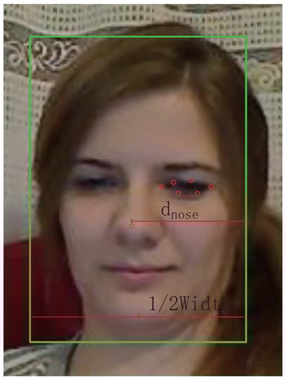 In an actual working environment, dispatchers always look at the control screen from left to right, so their faces would always be turned away from the camera. Because the distances between each eye and the camera are different, the positioning errors of the key points would increase. To solve this problem, we propose a method that selects the eye closest to the camera as the focus. When the dispatcher’s face is turned away, the eye that is closer to the camera is detected, as shown in Figure 5. In the figure, fw and fh represent the width and height, respectively, of the face frame, as detected with RetinaFace. The positioning point of the tip of the nose is compared with the face and the position of the center line of the frame in terms of the direction of the picture. If the tip of the nose is on the right, it detects the left eye in the image (the subject’s right eye); otherwise, it detects the right eye in the image (the subject’s left eye).