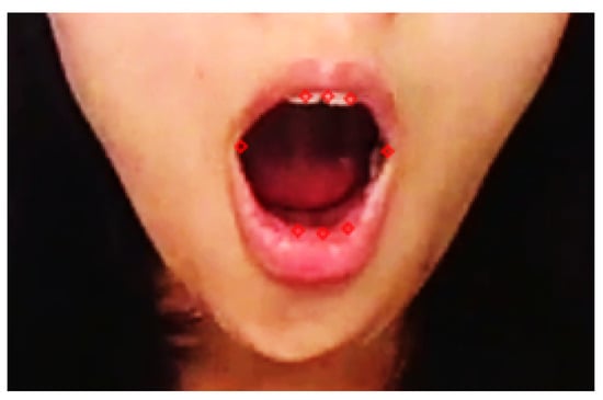 For the evaluation of facial movements with no occlusion of the mouth, we assumed that the mouth has four states: closed, slightly open, talking, and yawning. When the human body starts to experience tiredness, the frequency of yawning increases. When yawning, the opening of the mouth is the largest in the upward and downward directions, and the length between the left and right corners becomes narrower. Therefore, to accurately identify facial yawning movements, the mouth aspect ratio (MAR) of the upper lip and lower lips is introduced. The distance value is used as an indicator [25], and the index value is calculated with the coordinates of key points around the mouth. Since the mouth movement of yawning could be clearly distinguished from that of speaking, the occurrence of yawning could be determined using the MAR threshold method.