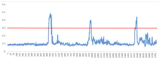 Generally, when yawning, the MAR changes greatly, which is different from the MAR value when speaking. In order to determine mouth states such as speaking, yawning, and closed, we used the aspect ratio to evaluate the samples, and the experimental results are shown in Figure 8. When MAR < 0.3, the mouth is closed or speaking. When 0.4 < MAR, we determine that the mouth state is yawning. Therefore, we directly use the fixed threshold method to detect yawning based on facial key points [37]. The changes in the mouth MAR are shown in Figure 8.