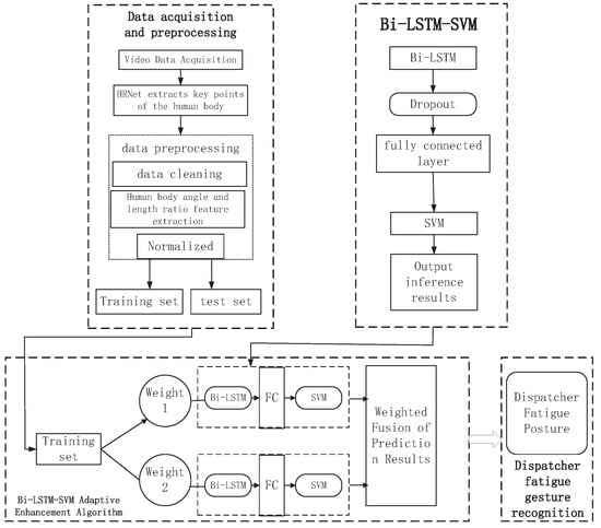 In order to classify the characteristics of a sitting posture when only half of the subject’s body can be captured with a camera, a human posture classification method based on a bidirectional long short-term memory neural network and an adaptive enhancement algorithm is proposed. Based on the HRNet key point detection model of body postures, multiple key points of the human body were extracted, and by constructing the angle and length features of human movements, an adaptive enhancement algorithm for movement recognition based on the bidirectional long-short-term memory neural network (Bi-LSTM) was built to improve recognition. This improved efficiency, reduced the risk of generalization error and recognized a dispatcher’s fatigue behaviors with excellent precision. The flowchart of the algorithm is shown in Figure 9.