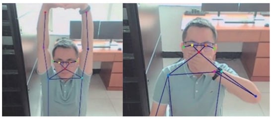 To evaluate behaviors, such as covering the mouth, that indicate yawning, we assumed that people have different habits when yawning. When some people yawn, they cover their mouths with their hands. When this occurred in the image sequences, it occluded the movement of the mouth, which made the determination of yawning using facial key points infeasible. To overcome this, we propose a method that identifies key points in the upper body and uses recognized behaviors to determine yawn occurrence. The schematic diagram is shown in Figure 1.