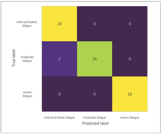 We provide a different model of behavioral and facial fusion features for fatigue state prediction. As shown in Table 8, the overall fatigue prediction effect of the model is satisfactory, and the evaluation indexes of each fatigued state are above 96%. The model made an error in the classification of mild-to-no fatigue and moderate fatigue and classified moderate fatigue as mild-to-no fatigue. The reason is that in two records, the subjects did not display behavior changes, such as yawning or eye fatigue, making their overall characteristics relatively similar. In future research, we will focus on optimizing the scoring mechanism based on the degree of subjective sleepiness and improve the distinctive characteristics of eye fatigue.