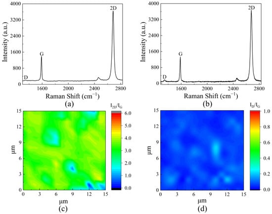 The Raman spectrum results have demonstrated that the stacked bilayer graphene has the same Raman spectra characteristics as monolayer graphene, so Raman surface scanning was only applied to monolayer graphene. As can be seen in Figure 1c, the intensity ratio of the 2D and G peaks is larger than 2.25, which corresponds to monolayer graphene film. There are several small regions with smaller ratios, indicating that there are more graphene film layers in these regions than in the single layers, which is probably because this is the nucleation point during graphene’s growth and the growth time is longer. From Figure 1d, we observe that the intensity ratio of the D and G peaks is less than 0.25, and the entire surface is more uniform, indicating that the prepared monolayer graphene has fewer defects, is highly intact, and possesses good homogeneity.