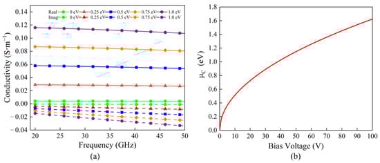 where is the Fermi velocity, is the thickness of the dielectric layer between the graphene and the bias electrode, is the magnitude of the bias voltage, and and are the vacuum dielectric constant and the dielectric layer dielectric constant, respectively. By employing K, ps, m/s, and nm, the results of Figure 1 can be derived. Figure 2a shows the relationship between graphene’s conductivity and chemical potential in the microwave band frequency. From the figure, it can be seen that both the real and imaginary parts of graphene conductivity increase with the increase in the chemical potential at the same frequency point, and the change in the real part is more significant than that of the imaginary part. The real part of the graphene conductivity at the same chemical potential does not vary much with the frequencies in the microwave band, and the imaginary part varies, but the value of the imaginary part is small and can thus be ignored. So, the conductivity of graphene in the microwave band can be approximated as a form of frequency-independent pure resistance, and the change in graphene conductivity due to frequencies can be ignored in the subsequent simulation. Figure 2b shows the graphene chemical potential versus bias voltage, which increases as the bias voltage rises [45,46]. Therefore, we can increase the conductivity of graphene by increasing the graphene bias voltage. In the microwave band, the change in the real part of the conductivity is mainly considered [47], while the change in the imaginary part is small and can thus be neglected.