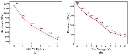 Figure 4a shows that when the bias voltage is 0 V, the square resistance of the monolayer graphene film is 1165 Ω/sq. When the bias voltage is 5 V, the square resistance drops to 445 Ω/sq, amounting to a 61.8% decrease. Figure 4b shows the measured square resistance of the stacked bilayer graphene. When the bias voltage is 0 V, the square resistance of the stacked bilayer graphene film is 416 Ω/sq. When the bias voltage is 5 V, the square resistance decreases to 208 Ω/sq, which corresponds to a decrease of 50%. When the bias voltage reaches 10 V, the square resistance decreases to 83 Ω/sq, constituting a decrease of 80%. From the above test results, it can be seen that the monolayer graphene film is more sensitive to the applied bias voltage than the stacked bilayer graphene film. However, in the actual test, the oxide layer of the silicon wafer was broken down in both models when the bias voltage was too high, and the regulation effect of the square resistance was lost. The maximum bias voltage of the stacked bilayer graphene film is greater than that of the monolayer graphene film. Although the tunability of stacked bilayer graphene film is not as good as that of the monolayer graphene film, the actual tuning range of square resistance is larger than that of the monolayer graphene film.