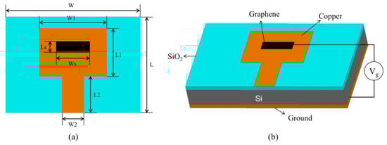 In 1979, “reconfigurability” was defined as “the ability to adjust the beam shape on command” [7]. Four main types of techniques are generally used to achieve reconfigurable antennas: switching structures, mechanically movable components, antenna arrays, and variable materials [8]. The most commonly used switching structures are electronically controlled switching structures such as PIN (positive-intrinsic-negative) diodes [9,10], variable capacitors [11], and radio frequency microelectromechanical system (RF-MEMS) switches [12,13]. However, RF-MEMS switches are costly [14], PIN diodes affect overall system performance [15] and have mechanical movable parts [16,17,18], and array antennas [19,20] are hindered by their large size. So, new methods of developing reconfigurable antennas still need to be developed. Graphene was first prepared in a laboratory in 2004 [21] and has since been employed in various applications to improve the performance of devices due to its excellent properties such as good electrical conductivity and high mechanical strength [22,23,24,25,26]. In addition, graphene is also attractive in the field of reconfigurable antennas because of its tunable conductivity [27,28,29,30,31].