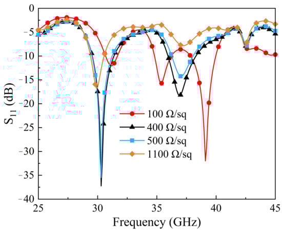 As shown in Figure 6, when the square resistance of graphene is 1100 Ω/sq and 500 Ω/sq, the center frequency of the antenna corresponds to 29.9 GHz and 30.3 GHz, and the change in frequency is only 0.4 GHz. When the square resistance of graphene is 400 Ω/sq and 100 Ω/sq, the center frequency of the antenna corresponds to 30.4 GHz and 39.1 GHz, and the change in frequency is 8.7 GHz. The simulation results indicate that the frequency-reconfigurable antenna using the stacked bilayer graphene film is more effective than the monolayer graphene film. Therefore, the stacked bilayer graphene films were used as the graphene component of the antenna in the subsequent experiments.