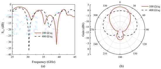 Figure 7 shows the simulation results of the frequency-reconfigurable antenna incorporating stacked bilayer graphene. The simulation results of the antenna reflection coefficient are shown in Figure 7a; they show that the square resistance of graphene decreased from 400 Ω/sq to 100 Ω/sq, while the center frequency of the antenna increased from 30.4 GHz to 39.1 GHz, with a frequency change of 8.7 GHz. The corresponding reflection coefficients under the two operating bands are −39 dB and −31.9 dB, and the antenna is well matched. Figure 7b shows the radiation pattern of the antenna in the yoz plane at the two frequency bands. When the square resistance of the graphene film is 400 Ω/sq, the direction of the radiation of the antenna in the radiation pattern at 30.4 GHz is more dispersed and the gain is −0.4 dBi, while when the square resistance of the graphene film is 100 Ω/sq, the direction of radiation of the antenna is more concentrated at 39.1 GHz and the gain is 3.1 dBi.