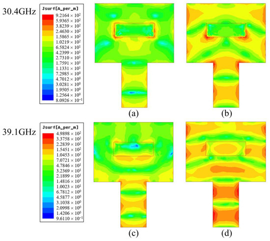 The surface current distribution on the antenna patch under the two operating bands is shown in Figure 8. Figure 8a,b show the current distributions of the antenna at 30.4 GHz, and Figure 8c,d show the current distributions at 39.1 GHz. As shown in Figure 8a,b, when the square resistance of the graphene film is 400 Ω/sq, the current enters different phases, the surface current of the graphene part does not change greatly, and the current density is lower than that of the copper part. Since the square resistance of the graphene film is higher and its conductivity is lower, the current flows to a greater extent in the copper part of the antenna, the graphene part does not influence the radiation of the antenna, and the radiation pattern of the antenna is close to the slotted patch antenna. The results in Figure 8c,d show that the phase of the current varies when the square resistance of the graphene film is 100 Ω/sq, and the surface current distribution of the graphene component is similar to the surrounding copper component. The surface current distribution changes with the phase change. The square resistance of the graphene film is low, and the corresponding conductivity is high, so the current flows uniformly in the copper and graphene components of the antenna. This result indicates that the graphene film is deeply involved in the radiation of the antenna and that the radiation pattern of the antenna is close to that of the patch antenna without slotting. The change in the square resistance of the graphene film leads to a change in the surface current distribution of the antenna at the two operating bands. The radiation mode of the antenna switches between the nearly slotted antenna and the nearly unslotted antenna, so the center frequency of the antenna also changes. Finally, the frequency reconfigurability of the antenna is realized. The variable radiation performance of the graphene component at the two operating bands is also the reason why the radiation direction map of the antenna is more concentrated when the graphene square resistance is 100 Ω/sq than when the graphene square resistance is 400 Ω/sq.