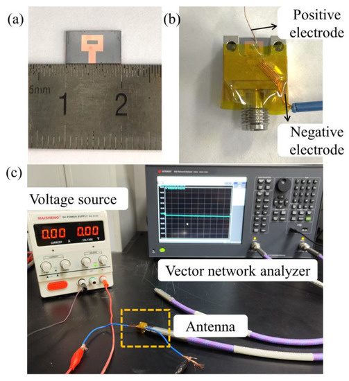 In order to verify the frequency reconfigurability of the designed antenna, an antenna prototype was fabricated, as shown in Figure 9a. Figure 9b shows the antenna with bias voltage. A DC voltage source was used to apply a bias voltage to the graphene film. The positive electrode of the power sources connects to the copper part of the antenna, and the negative electrode of the power sources connects to the housing of the connector. Bias voltage was applied to the ground plane of the antenna and the graphene film of the antenna patch according to the above connection method to change the graphene conductivity. The test environment of the antenna is shown in Figure 9c.