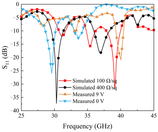 A comparison of the reflection coefficients between the measurement and simulation for the antenna is shown in Figure 10. The square resistance of the graphene film is 400 Ω/sq and 100 Ω/sq when applying a bias voltage of 0 V and 9 V, respectively. There are slight deviations between the simulated and tested results, but the overall trend of the curves remains consistent. When the bias voltage of 0 V is applied to the graphene, the center frequency of the antenna is 29.6 GHz, and the corresponding reflection coefficient is −26 dB. When a bias voltage of 9 V is applied to the graphene, the center frequency of the antenna increases to 40 GHz, and the corresponding reflection coefficient is −20.8 dB. Under the two bias voltages, the center frequency of the antenna is shifted by 10.4 GHz, and frequency reconfigurability is achieved. Thus, the frequency-reconfigurable function has been achieved, and the antenna is well matched at both bias voltages.
