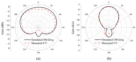 Antenna yoz-plane radiation patterns. (a) Simulated 400 Ω/sq vs. measured 0 V. (b) simulated 100 Ω/sq vs. measured 9 V.