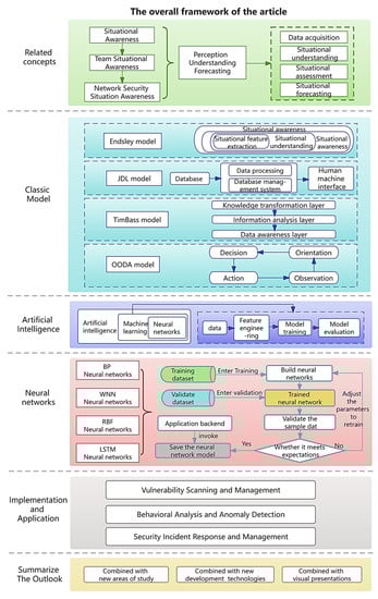 This paper mainly summarizes and organizes the basic concepts of Internet situational awareness, system modeling, and the current research status of machine-learning-based network security situational awareness, providing a reference for researchers in the field of network security; the structure of the article is shown in Figure 1. The contributions of this paper are as follows: