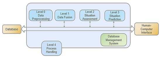 Data fusion refers to the process of collecting data from multiple information sources, connecting and cross-combining them to improve the efficiency and accuracy of data analysis. The Joint Directors of Laboratories (JDL) model [] was proposed by the United States military organization, as shown in Figure 4. The JDL model consists of data sources, data processing, database management systems, and human–computer interfaces, among which data processing is the most important part, divided into five levels to provide a unified framework for data processing in different fields and clearly define the process and function of data processing.
