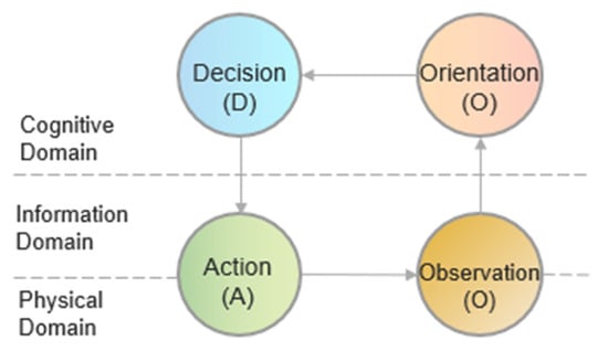 The Observe–Orient–Decision–Act (OODA) loop model [] was proposed by John Boyd, a U.S. Air Force Colonel, in the 1970s based on his experience as a fighter pilot and his research on energy maneuverability. It has been widely applied from its original theoretical foundation on air force strategy to a general strategic approach and to the field of military theory. The OODA loop model describes the process of perceiving purpose and activity, and divides the cycle of situational awareness into four stages—observe, orient, decide, and act—as shown in Figure 6.