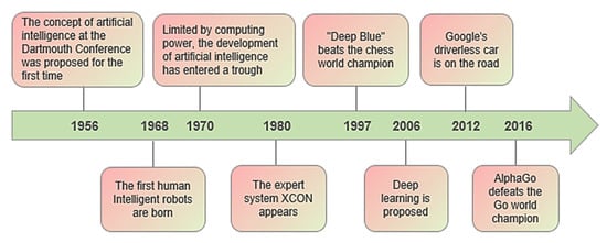 In 1956, the concept of a new generation of artificial intelligence was first proposed at the Dartmouth Conference []. Over the next decade, the field made significant progress, achieving noteworthy results in many areas, as shown in Figure 7. However, in the 1970s, despite deep research into the field by many developed countries, the technical challenges faced by artificial intelligence proved difficult to overcome, resulting in slow progress. In the 1990s, with the development of technology, artificial intelligence once again became a hot topic. The emergence of machine learning and algorithms also helped to drive the development of artificial intelligence. Technology giants joined forces to conduct research and development, making artificial intelligence a focus of widespread attention once again.