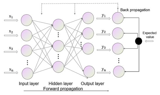The backpropagation (BP) neural network is a theoretical model proposed by research scholars, led by Rumelhart and McClelland, in 1986. It uses the method of error backpropagation and trains with a multi-layer feedforward neural network []. The forward propagation of signals and the backward propagation of mistakes make up its primary methodology. That is, when calculating the output error, it follows the direction from input to output; while adjusting the weights and thresholds follows the direction from output to input. Its structure is shown in Figure 9. This structure has an excellent nonlinear mapping ability and a flexible network structure. Depending on the specific situation, the number of intermediate layers and neurons in the network can be flexibly adjusted, and different structural designs can also affect the network’s performance.