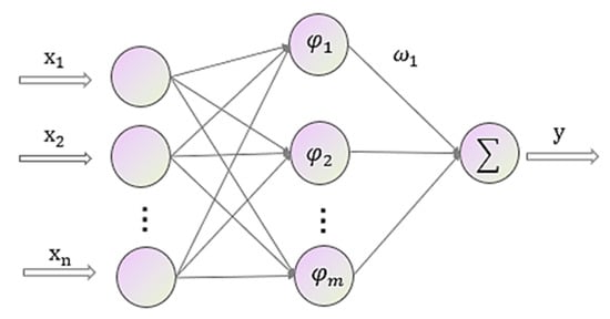 The radial basis function neural network (RBF neural network) is a type of commonly used three-layer feedforward neural network, as shown in Figure 12. It is a model proposed by Broomhead, Lowe, Moody, and Darken in 1988, which uses radial basis functions in neural networks. The RBF network system [,] has the advantages of a simple construction, fast learning rate, excellent approximation performance, and strong generalization ability, making it an ideal choice for complex nonlinear systems, especially for network security situation prediction. By combining the RBF neural network with time series prediction techniques, network security conditions can be effectively predicted, thereby improving network security performance.